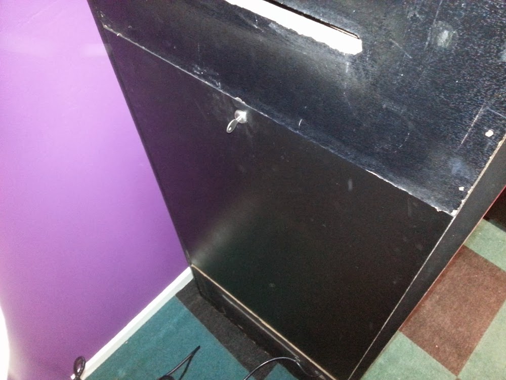 I was going to cover the door with some adhesive vinyl, but after seeing how the spray looked decided to cover the whole panel in spray and leave it at that for now. As you can see below the lock is fitted and the original Atari Information sheet was re-stapled to the inside of the door.
