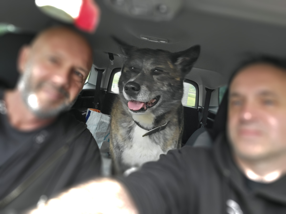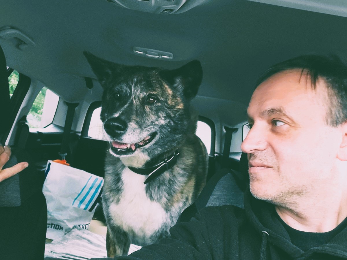 There’s my former colleague — who’s become a friend — Olivier, and Zola, his loyal American Akita, eight years old.