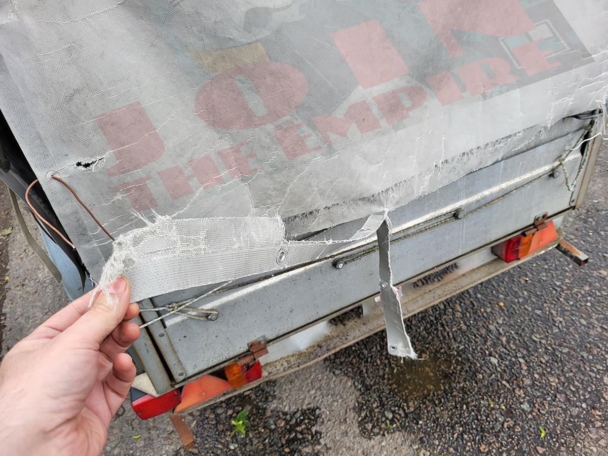 When that part tore, the rear section of the tarp started hitting the top of the trailer cover, and with the speed, it created a loud slapping sound — exactly the noise we heard while driving.