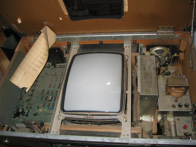 you see the stand up has a black light with the moon station, the monitor is on the bottom of the cab and the image is reflected on a miror ...